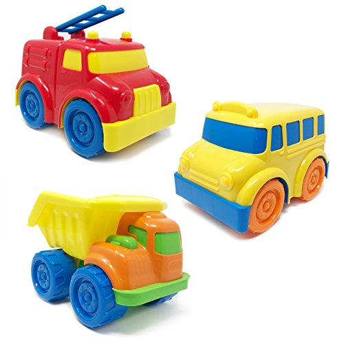 VIBRANT AND BEAUTIFUL: Vibrant and colorful trucks makes this an attractive staple for any children's toy truck set. Each vehicle in the baby girl or baby boy trucks has very round edges and a smooth feel making it easy for your child to grab. All vehicles come with extra large wheels with contrasting colors so its easy to see as it flys across the room!