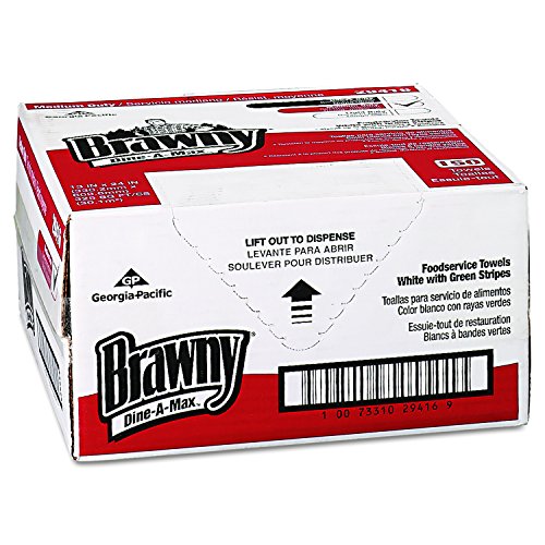 Studio : Georgia-Pacific Publisher : Georgia-Pacific Binding : Misc. Product Description These super strong, chemical-resistant Brawny Dine-A-Max foodservice towels clean up on the competition when it comes to thickness, absorbency/capacity, softness and durability. These premium towels deliver superior cloth-like cleaning to handle almost any job and are especially designed for fast, streak-free wiping on messy tabletops, grimy countertops, and even the greasiest stove tops. You name it- this wiper can handle it. Long-lasting, machine-washable towels come in a convenient dispenser box for added protection and quick, easy dispensing. 0