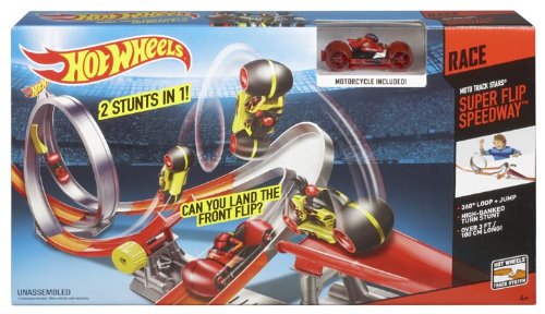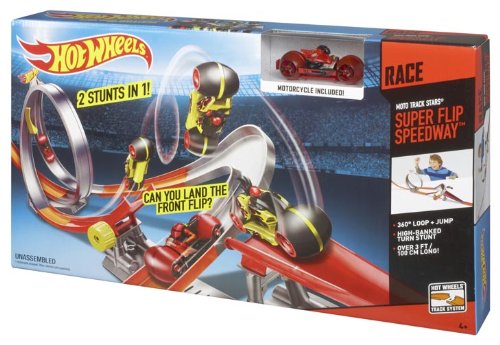 - Feature : Exciting tricks highlight the unique capabilities of the Moto Track Star vehicles / Drift, skid, jump, flip - these Track Stars always land right side up on their wheels! / Adjustable jump and catch ramp enable a front flip / High-banked turn enables drifting action / Split loop features diverter so boys can switch between two types of stunts