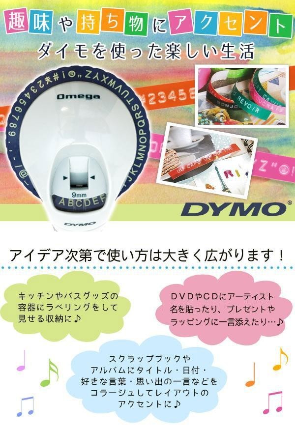 | 「浮き上がった文字が味わい深さを感じさせるテープ」。ダイモのテープライターはそんなテープをつくることができます。スクラップブックやアルバムにタイトル・日付・思い出の一言などをコラージュしてレイアウトのアクセントに。キッチンやバスグッズの容器にラベリングをして見せる収納にも。またDVDやCDにアーティスト名を貼ったり、プレゼントやラッピングに一言添えたりと、アイデア次第でその使い方は大きく広がります。 |