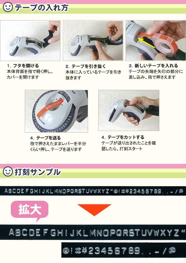 | 仕様 | 【文字盤】1枚(交換不可) 英大文字・数字0〜9・記号 【対応テープ幅】 9mmテープ幅各種 |