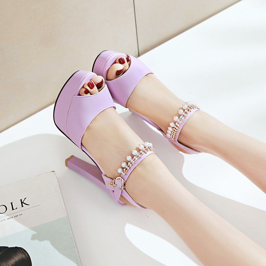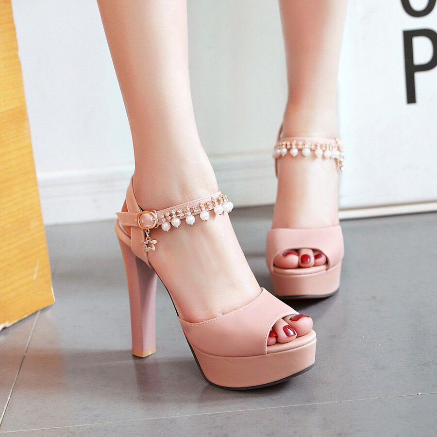 韩版百搭性感一字扣白色带高跟凉鞋女夏珍珠粗跟鱼嘴鞋子