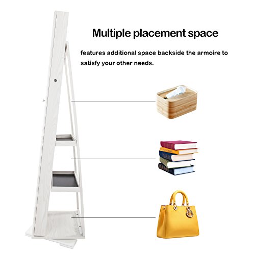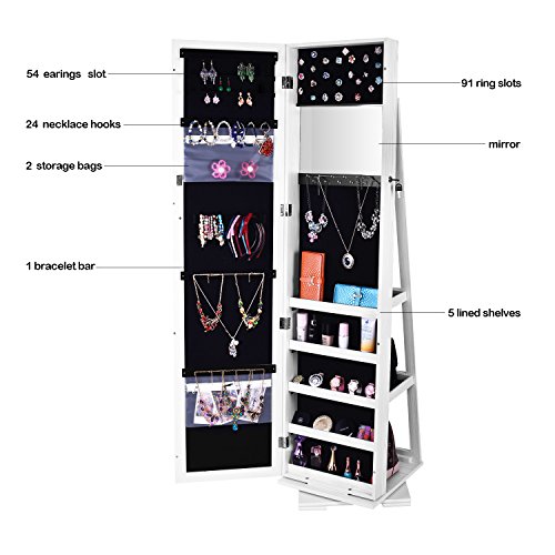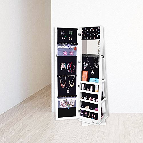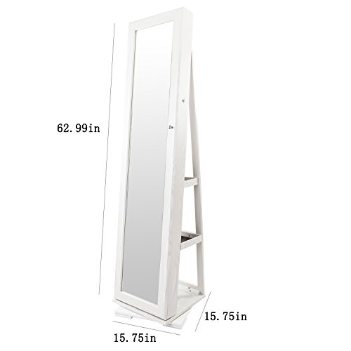 Studio : Bonnlo Publisher : Bonnlo Binding : Kitchen Product Description Features: 1. It has a spare mirror inside 2. All of the internal space has a villous render; it feels soft and comfortable, and not easy to damage the ornament place in it 3. The mirror is smooth and real, without distorting mirror effect 4. Solid plate base design, security and firm 5. Large Space, with all kinds of hook, meet all your place demands. 90 rings card slot, there are 12 hooks in a row, 42 earring holes and 6 special hooks in the middle 6. Overlong mirror length meets all your demands, completely accord with human body engineering 7. A complimentary key firmly lock the precious items. To ensure the safety of your property 8. Designed of 360 degrees rotation, meet all your place demands 9. There are two large drawers at the back ? Specifications: 1. Main Material: P2 High Density Board PVC Wood Grain Coating High Quality Velvet Silver Mirror 2. Color: White 3. Style: Rotate 360 Degrees Floor Type with Small Mirror Inside 4. Weight: 776.03oz / 22000g 5. Dimensions: (62.99 x 15.75 x 15.75)" / (160.00 x 40.00 x 40.00)cm (L x W x H) Package Includes: 1 x Jewelry Mirror Cabinet 1 x Screw Bag 1 x Manual Maintenance Instructions: Wipe dry with a clean and soft cloth dipped in water, disable containing corrosive cleaner, and avoid sun exposure