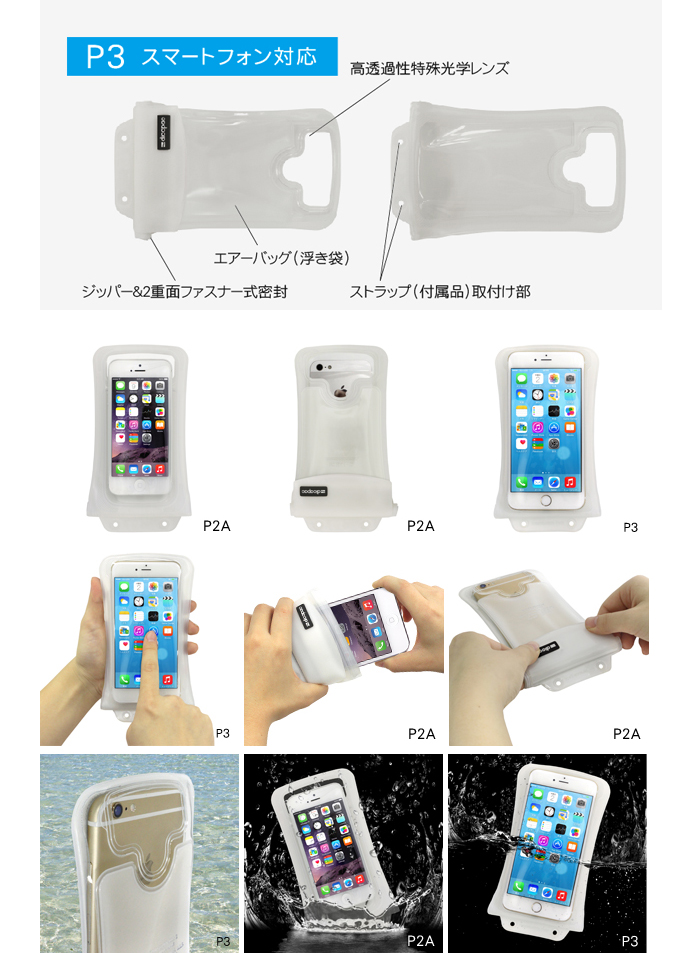 ●P3(スマートフォン対応):iPhone3G、3GS、4、4S、5、5S、5C、6、6Plus、対応スマホサイズ:約(縦)160mm×(横)84mm×(厚み)8.5mm以内