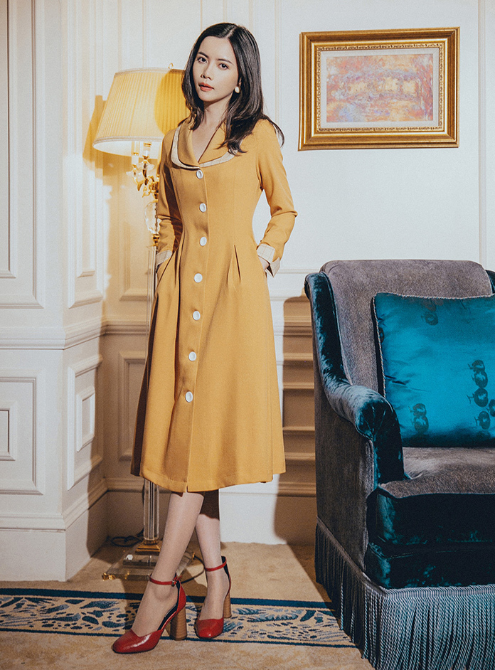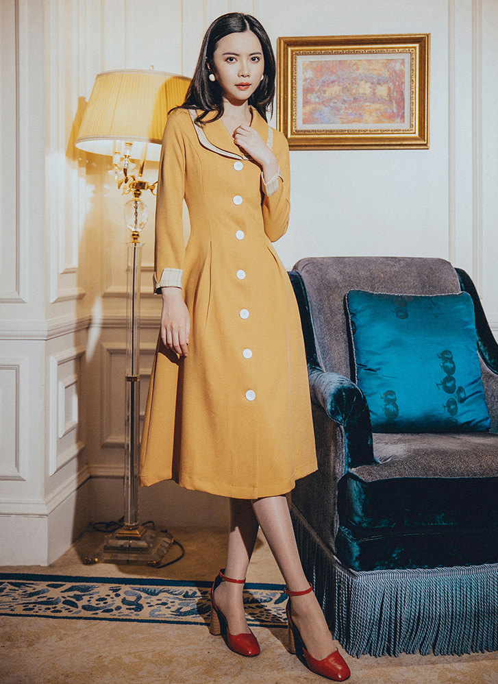 ウエスト部は細くたっぷりのタックで、スカート部はふんわりと広がるデザインなのでスタイル良く見せてくれ、また丸い襟は柔らかい印象を演出してくれます。