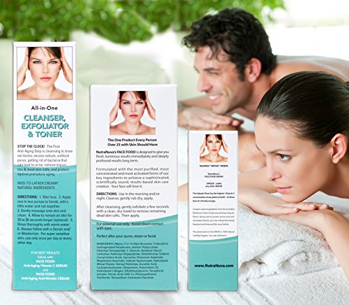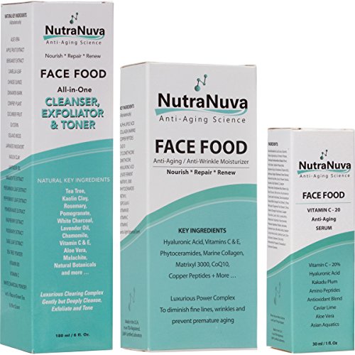 -. Feature : The "STOP-THE-CLOCK!" Value Bundle contains 3 Items from NutraNuva: FACE FOOD Anti-Aging Anti-Wrinkle Moisturizer + FACE FOOD Anti-Aging Serum Complex with 20% C + FACE FOOD Cleanser, Exfoliator & Toner All-in-One. Each Product is Loaded with Whole Foods Standards Approved, Natural Key Ingredients - For Men & Women of All Ages. A Perfect Gift. / NO HARMFUL FILLERS, PARABENS, DYES, SULFATES. PEGs, PETROCHEMICALS or ANIMAL TESTING. GMO & GLUTEN FREE. Made in the U.S.A. in an FDA-Registered State-of-the-Art Laboratory with Green, Recyclable Packaging. Each Also Sold Individually Here on AMAZON. / 1 - FACE FOOD Anti-Aging Anti-Wrinkle Moisturizer is a Night / Day Face & Eye Moisturizer Cream with Vitamin C - Hyaluronic Acid - PhytoCeramides - Amino Peptides - Retinol - Copper Peptides - CoQ10 - Vitamin E - Matrixyl 3000 - Marine Collagen and more. 2 Full Ounces. A Little Goes a Long Way. / 2 - FACE FOOD Anti-Aging Serum Complex with 20% C - Contains an Exotic Tropical Plant called the KAKADU PLUM which has the Most Potent Vitamin C on Earth - 55 Times More than a Florida Orange (Source: U.S. Dept. of Agriculture) plus Hyaluronic Acid - Amino Peptides - Caviar Lime with Natural Alpha Hydroxy Acids - Niacinamide - Asian Aquatic Plants (Bamboo, Lotus & Water Lilly) - Aloe Vera and more. 1 Full Ounce. / 3 - FACE FOOD Cleanser, Exfoliator & Toner All-in-One. Clear, Clean, Smoother, More Radiant Skin with a Soothing Natural Green Tea & Mint Scent - Tea Tree Powder - Kaolin Clay - Lavender Oil - Vitamin C & B5 - White Charcoal Powder - Aloe Vera - Botanical Extracts from Rosemary, Pomegranate, Cinnamon, Persimmon, Peppermint, Apple, Raspberry, Comfrey, Cucumber and more. Concentrated with 6 Full Ounces - Equivalent to 12 Ounces of other products. P.R.Ice Equals 10% Off Individual P.R.Ices - BEST VALUE