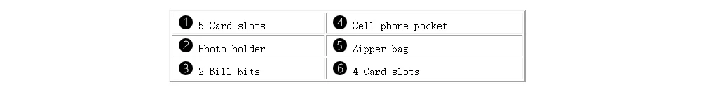 Interior:Interior Slot Pocket,Cell Phone Pocket,Interior Compartment,Zipper Poucht,Coin Pocket,Note Compartment,Photo Holder,Card Holder