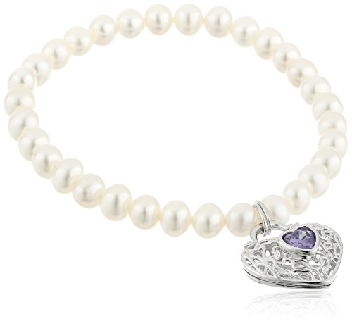 -. Title : Sterling Silver 6-7mm White Potato Freshwater Cultured Pearl and Cubic Zirconia Heart Stretch Charm Bracelet
