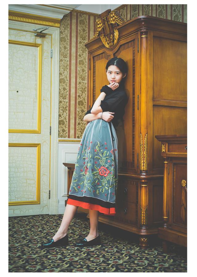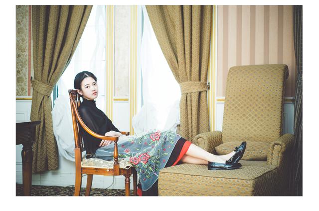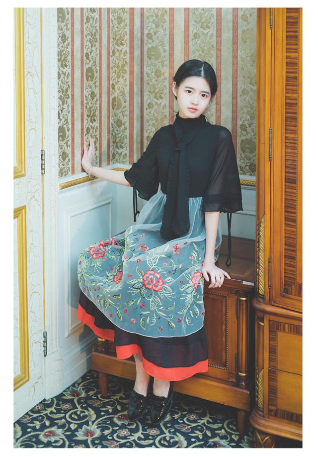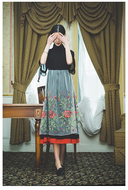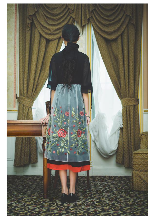 透け感のシフォンオーガンジー素材で、黒の上に重ねたお花の刺繍や裾のラインがレトロかわいいコンビネーションワンピースです。