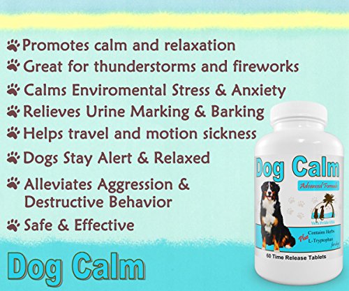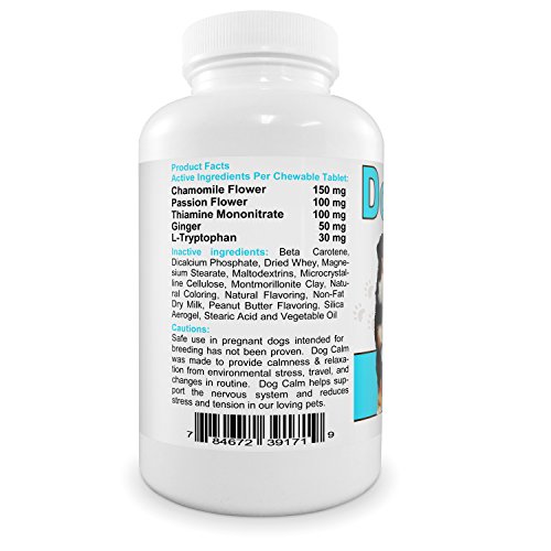 -. Feature : DOG CALM herbal formulation can be just what the doctor ordered, especially if you have a dog suffering from continuous bouts of anxiety. It's especially helpful when the source is out of your control like thunderstorms or fireworks. The ingredients work together synergistly to help your dogs keep calm. Here's why you'll love DOG CALM: / Chamomile is a natural herb that has muscle relaxing, anti-inflammatory and anti-spasmodic effects. Passion Flower is especially useful for separation anxiety and aggression brought on by fear. It's also helpful for jitteriness, muscle twitching, and hypersensitivity to touch. / With adE.q.u.a.t.e Thiamine levels your dog will experience less mental confusion, nervousness and muscle weakness. Ginger especially relieves motion sickness, nausea, and digestive upsets which are often experienced during travel. / L-Tryptophan is an amino acid and ideal for dogs because it is quickly well-absorbed by the brain, where it helps release serotonin - the "feel good" hormone. Serotonin acts to increase relaxation, reduce impulsivity and aggression, increases stress resistance and stabilize mood. / That's why you'll love DOG CALM. Its natural formulation can be just what the doctor ordered. It has a 100% Money Back Guarantee and Made in the USA.