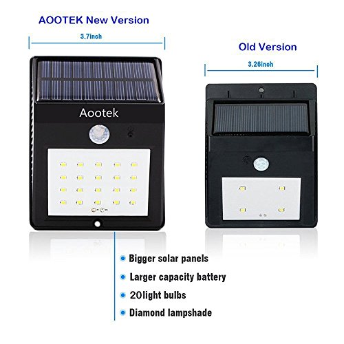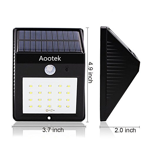 2.120 °Wide Sensing Range Aootek Solar motion light installed with sensitive sensor ballhead,The recommended install height is 5.6-6.6 FT, it can detect motion up to 10-26 feet away at a 120 degree angle. This solar power motion light automatically turns on when it senses the motion of someone driving to your house or walking to your door.