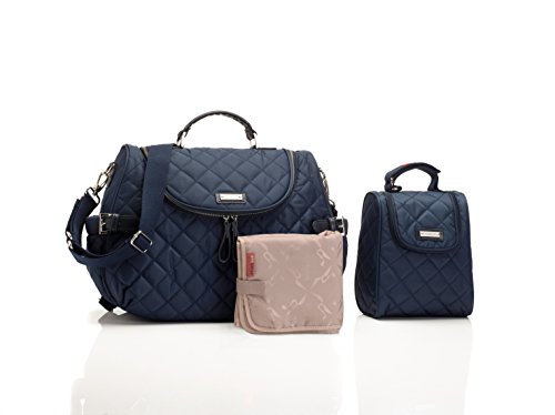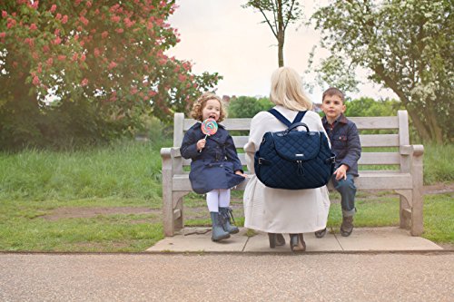 The Poppy Convertible Backpack quilted set is a beautiful and innovative bag from Storksak. The bag is equipped with a matching quilted change pad and matching quilted insulated double bottle holder. The Poppy includes 2 outer side pockets and 5 inner pockets to keep things organized and easy to reach. Detachable and adjustable shoulder strap also includes your stroller clips giving you the option to easily convert it to a backpack or a messenger bag. Everything you need and more for your diaper bag.Feature