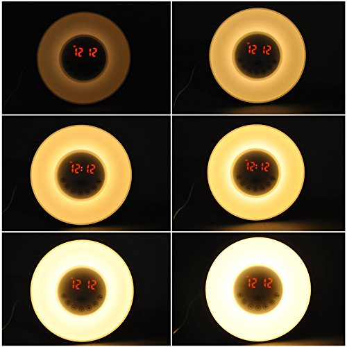 ✹ 7 Colors & 10 Brightness: As a night light alarm clock, it can act as atmosphere beside lamp by selecting 7 colors-warm white, green, red, blue, purple, orange and indigo light, or works as warm white LED light with 10 adjustable brightness setting.