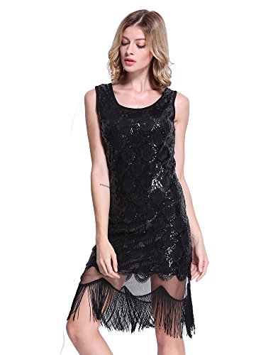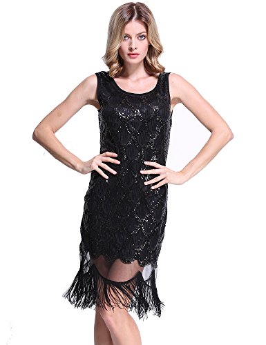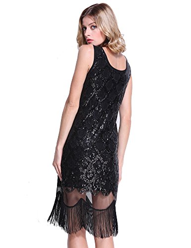 PrettyGuide Women 20s Art Deco Sequin Fishscale Tassel Hem Flapper Party Dress Black M