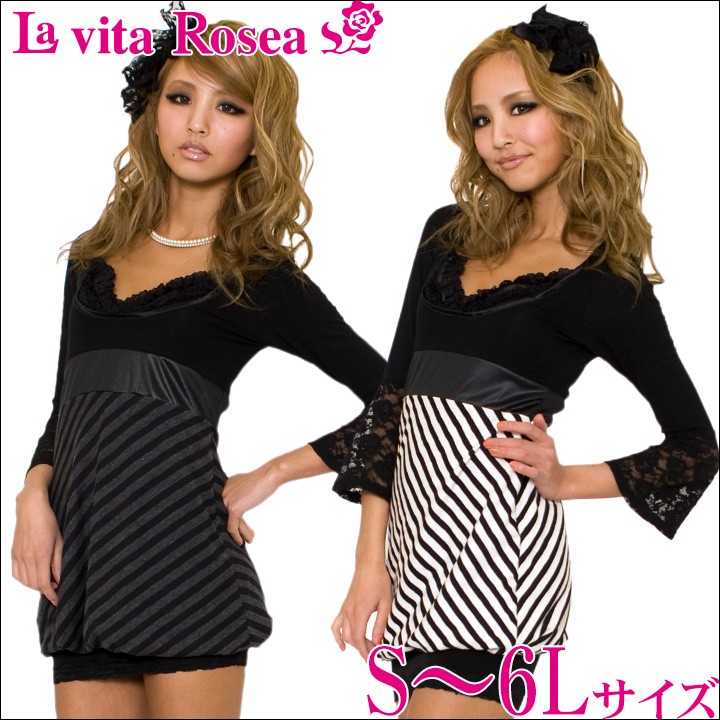 ボーダー切替えレーススリーブワンピース(CP) 大きいサイズ 春 セクシー レディース ギャル服 ギャル 大人 13号 15号 17号 19号 LL 2L 3L 4L 5L 6L 6L