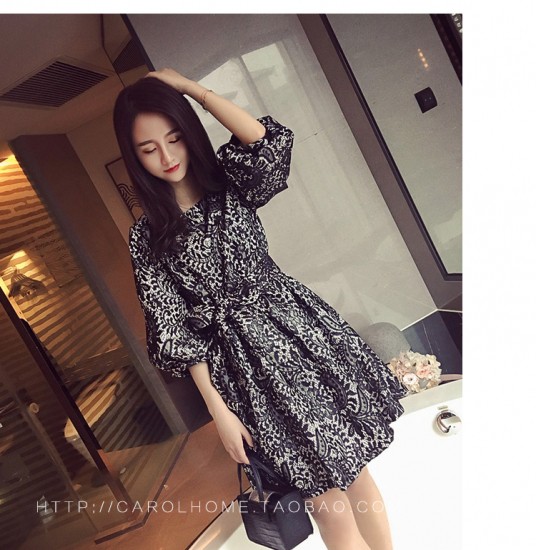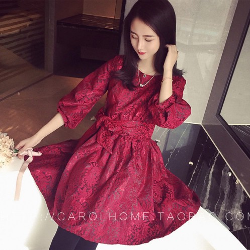 ワンピース ひざ丈 ドレス レース ハイウエストパフスリーブ 花柄 リボンベルト 刺繍 drgz1301
