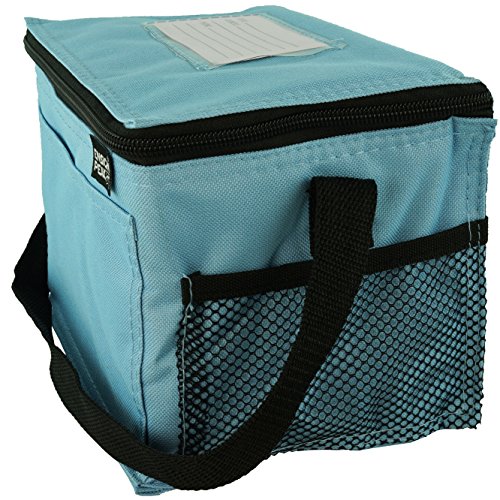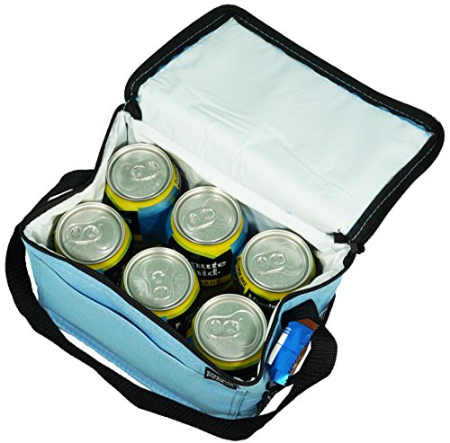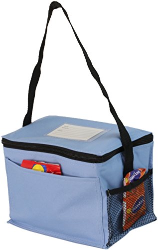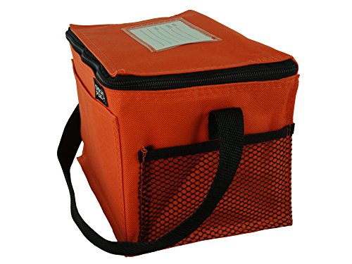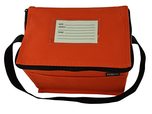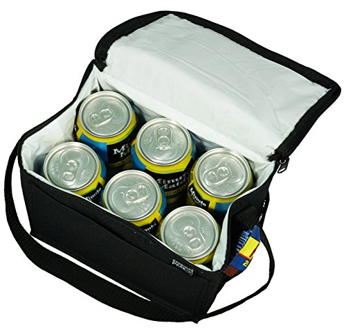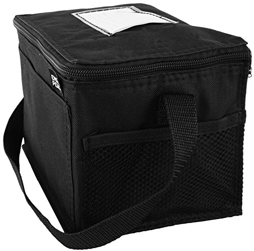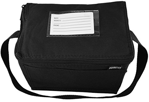 -. Feature : Insulated Main Compartment / Front Pocket / carrying Strap / 8.5" wide x 6" high x 6" gusset (outside dim) / 600 D Poly Oxford with PVC Backing.