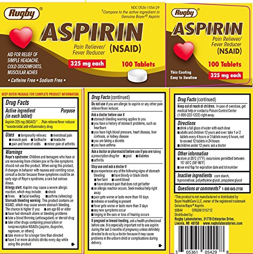 Rugby Aspirin Tablets 325 mg 100 Count per Bottle
