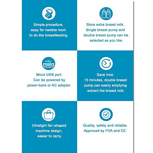 -. Feature : Approved by U.S. Food and Drug Administration(FDA) and European Conformity(CE) quality, safety and reliable / Single breast pump mode and double breast pump mode can be selected as you like, simple and convenient / Just only 15 minutes,double breast pump mode can easily emptying extract the breast milk / Micro USB port, easy to use.Can be powered by power-bank or phone adapter / Ultralight fair-shaped machine design, easier to carry
