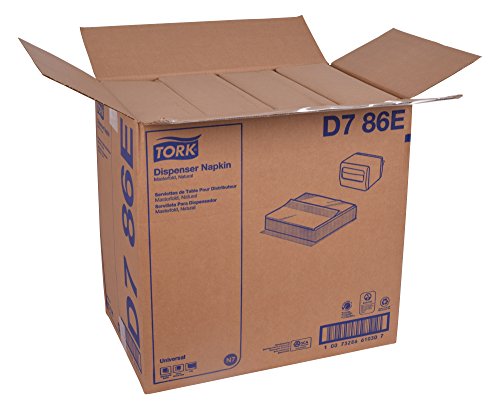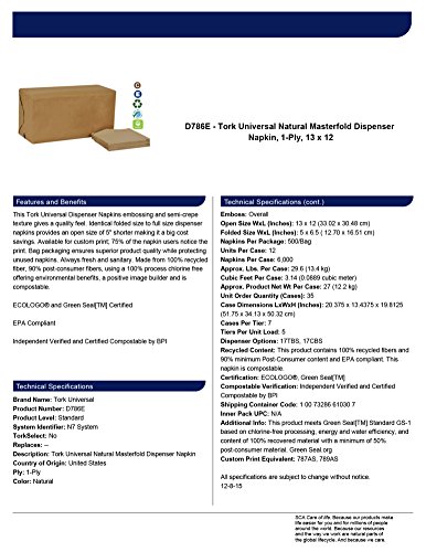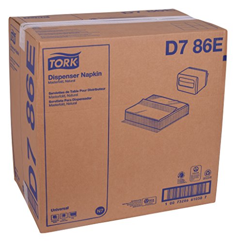 Tork Universal Dispenser Napkins include an embossing and the semi-crepe texture provides a quality feel. This napkin offers an identical folded size to a full size dispenser napkin to provide an open size of 5"" shorter to offer a larger cost savings. Bag packaging ensures superior product quality while protecting unused napkins in package sizes of 500 napkins per pack. Always fresh and sanitary. Made from 100% recycled fiber, which includes 90% post-consumer fibers, and is manufactured with a 100% chlorine-free process which offers environmental benefits and is a positive image builder. For use with Tork 17TBS and 17CBS Napkin Dispensers. ECOLOGO Certified and Green Seal Certified EPA Compliant Independent Verified and Certified Compostable by BPI 0 |