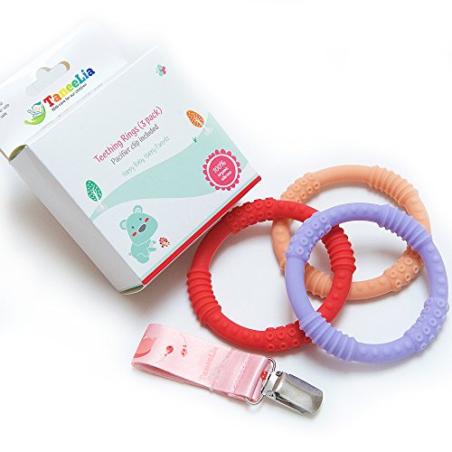 HELP YOUR BABY RELIEVE TEETHING PAIN WITH TANEELIA TEETHER RINGS OR YOUR MONEY BACK - Our teethers are perfect solution for your baby’s pain relief during teething. They are soft enough for your infant to hold and chew, but have the right firmness to be EFFECTIVE FOR TEETHING DISCOMFORT. You can even put them in the freezer for some extra pain relief. The freezer will chill them but won’t make them hard. Great affordable alternative to Sophie the giraffe, molar, banana and other teether options.