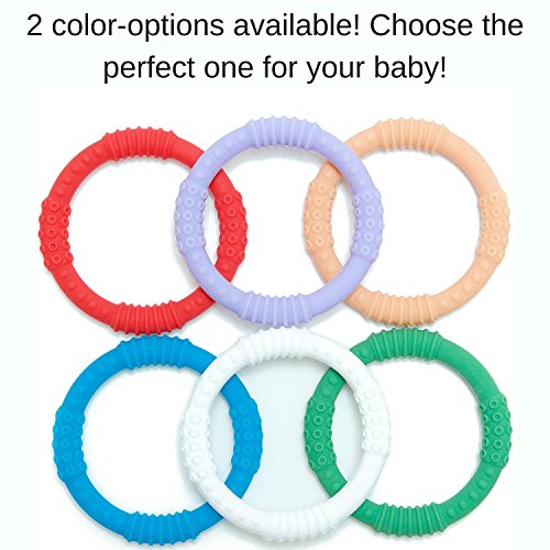 NO MORE CRYING TANTRUMS OR TEETHING DISCOMFORT - Made from non-toxic 100% food grade silicone our baby teether is totally SAFE FOR YOUR CHILD. With VIBRANT COLORS AND SOFT TEXTURES they are easy for infant to find and grab. Your baby will be able to chew these rings safely and easily and you don't have to worry about his/her hurting himself/herself. The teethers are soft to the bite yet TOUGH ENOUGH TO HOLD-UP TO CHEWING. EASY TO CLEAN and MAINTAIN. DISHWASHER and sterilizer machine SAFE.