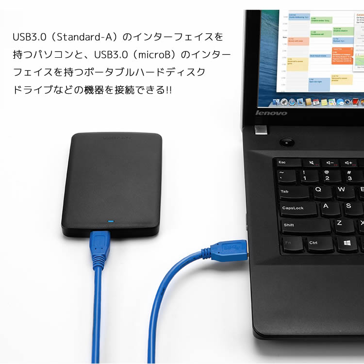USB3.0規格の「Standard-A」端子を持つパソコンと、「micro-B」端子を持つポータブルHDDなどの周辺機器を接続するのにお勧めです。