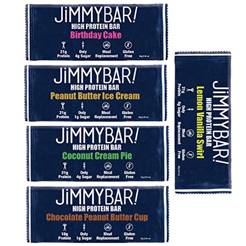 -. Feature : CLEAN HIGH PROTEIN BAR: 21g Protein, 4g Sugar, 260 Calories and gluten free. / 5 CLEAN FLAVORS: Try - Chocolate Peanut Butter Cup, Birthday Cake, Coconut Cream Pie, Lemon Vanilla Swirl, or Peanut Butter Ice Cream. / CLEAN PROTEIN: JimmyBars! made with high quality whey protein and wholesome ingredients to create a better snack on the go! / CLEAN ENERGY PACKED: Great for a pre-workout bar, recovery bar, or protein breakfast bar JimmyBars! will keep you full for up to 6 hours. / ADVENTURE SNACK FOOD: JimmyBars! make great gluten free hiking cycling running workout recovery food and even make a perfect office snack. Enjoy them anywhere you are.