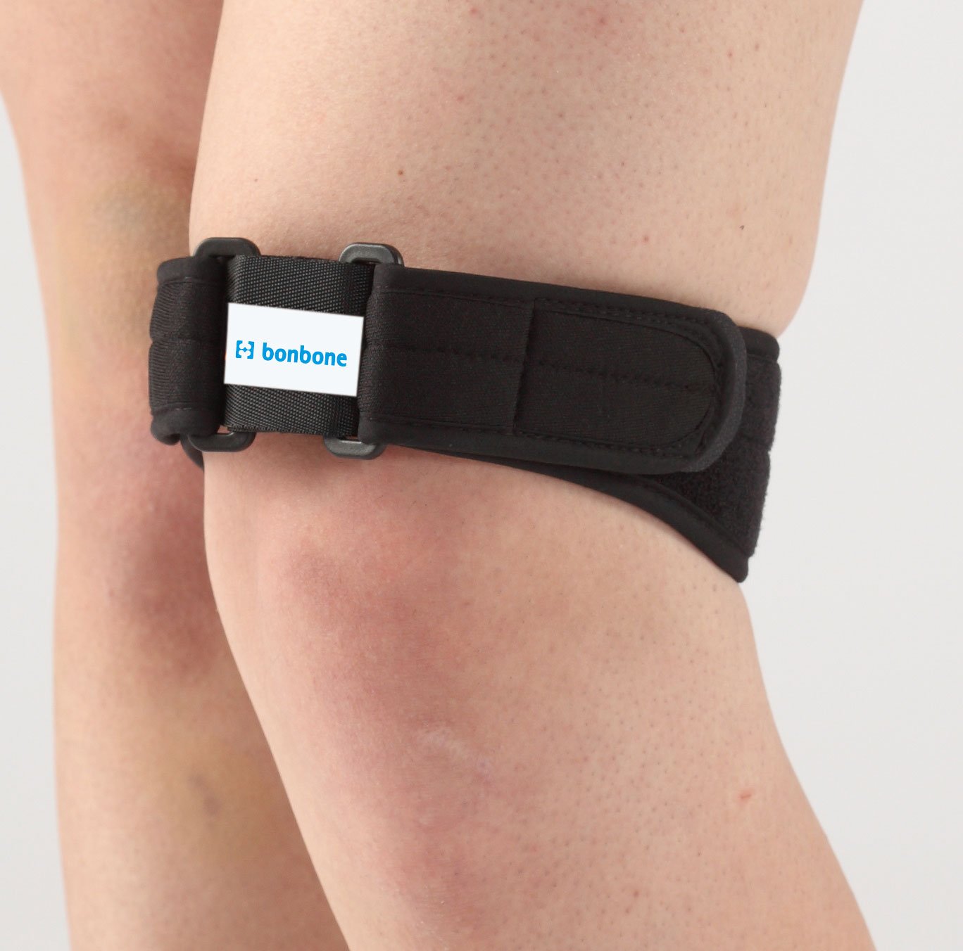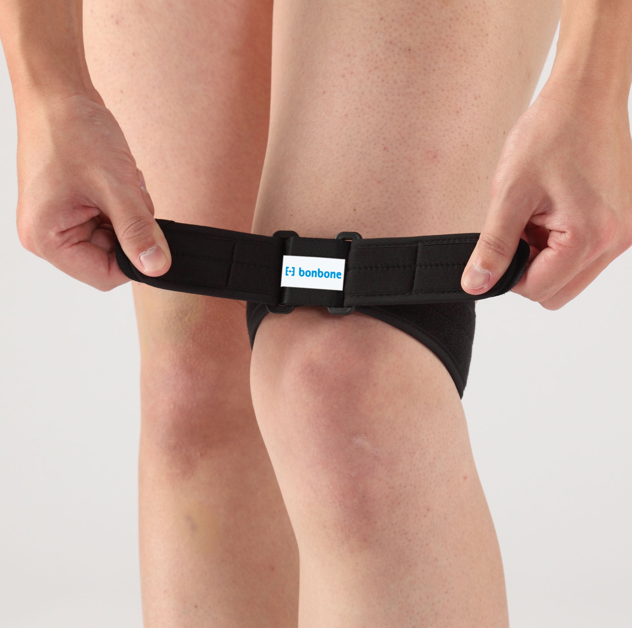 By compressing the front of the patellar base of the quadriceps femoris with a pad and creating a fulcrum in front of the adhered part, stop the force transfer directly to the attachment part of the tendon one step forward.