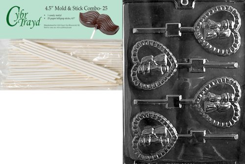 Cybrtrayd 45St25-W049 Bride and Groom Heart Pop Wedding Chocolate Candy Mold with 25-Pack 4.5-Inch Lollipop Sticks