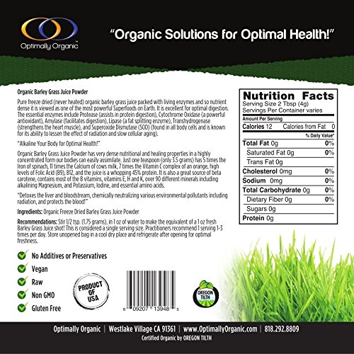 -. Feature : Raw Organic Freeze Dried Barley Grass Juice Powder. / Organically grown in the USA. / USDA Organic. / Pure, Bioactive, Enzyme Rich, and Alive. / Made in USA.