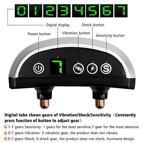 -Mode of Beep, Vibration, Shock with 0-7 Grade 7 Adjustable Sensitivity The bark collar has 2 modes: beep vibration/ beep shock when you press the vibration/ shock signals, you could adjust the level from 0-7. When the screen shows "0" , it means the collar only produce beep to stop barking. When it shows 1-7, the bark collar will beep, and then vibrate or shock for different levels