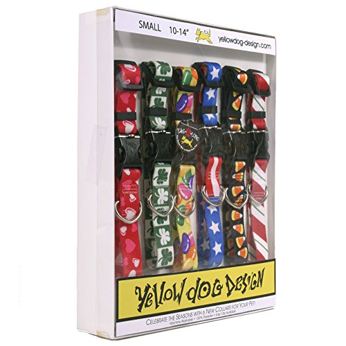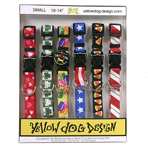 Studio : Yellow Dog Design Publisher : Yellow Dog Design Binding : Misc. Product Description This is the Seasonal Dog Collar Calendar Pack with Tag-A-Long - Size Small - 3/4 inch wide and fits neck sizes 10 to 14 inches from Yellow Dog Design, made right here in the USA. Keep your dog in the latest fashion with this stylish, functional and durable dog collar. TAG-A-LONG - This brand new, patent pending Pet ID Tag system is built right in to this dog collar. The Tag-A-Long system makes it easy to swap out ID tags from one collar to another, or to change ID Tags on the same collar. Perfect for when a special tag is needed at the dog park, on the beach, or as a service dog. We've included this special feature at no cost! EASY ON EASY OFF - Using a quick release clasp, the collar can easily be taken on or off the dog. Don't worry though, opposable thumbs are necessary to activate the quick release. SIZING: This dog collar utilizes a quick clasp closure, also called a side release clasp. Sizing is given as a range of neck lengths. Measure your dogs neck size or its current collar length (not including buckles) to obtain correct sizing. If you are shopping for designer, affordable dog/pet collars, then look no further. These durable, guaranteed to last dog collars have no rough edges, no threads to fray or break, no problem going in the wash, and no stress getting them on or off your dogs. 0