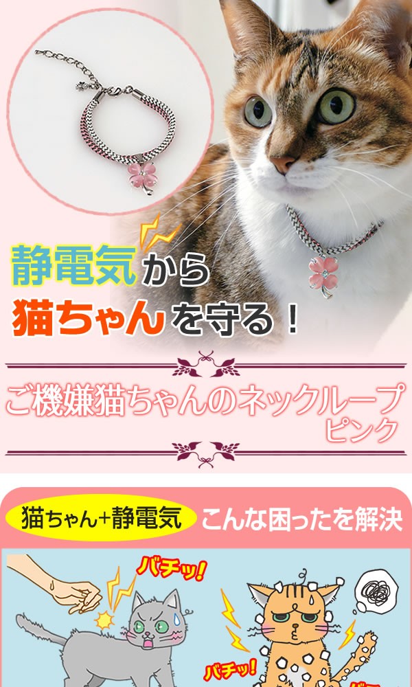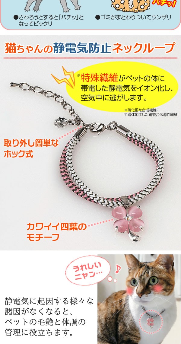 | <h1>ブラッシング等で発生・帯電する静電気を空気中に逃がす猫ちゃんの静電気除去ネックループ。取り外し簡単なホック式。首廻り20cmまで対応。よつ葉のクローバ型チャーム付きでとってもかわいい。猫/静電気/ひっつく/バチバチ/くず/静電気除去/除去/毛玉/冬/ペット/犬/首輪/飾り</h1> |