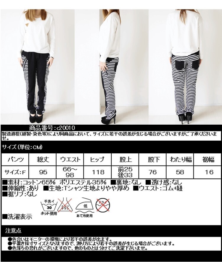パンツ 総丈:約95cm ウエスト:約66~98cm ヒップ:約118cm 股上:約前25、後33cm 股下:約76cm わたり幅:約58cm 裾幅:約16cm |