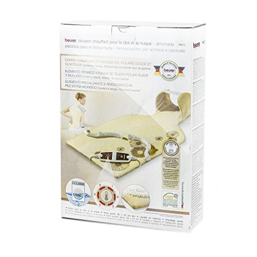 -. Feature : Cosy Rücken-Nacken Heizkissen, Flauschig weicher Heizkörper aus Micro-Flauschfaser, Atmungsaktiv, anschmiegsam und hautsympatisch / Körpergerechte Form für Rücken und Nacken, extra großes Format: ca. 62 x 42 cm / Abnehmbare Zuleitung, Maschienenwaschbar bis 30°C, Abnehmbarer Micro-Flauschfaser Bezug - Waschbar, Öko-Tex / Beurer Sicherheitssystem, Elektronische Temperaturregelung, 3 beleuchtete Temperaturstufen / Schnellheizung, Abschaltautomatik nach ca. 90 Minuten, 100 Watt,