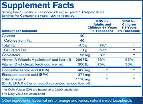 -. Feature : Cod liver oil formula to support cognitive function, brain and nerve development and healthy bones, teeth, eyes, and skin. / 10.1 fl. oz. / This product is dairy free, gluten free / *This statement has not been evaluated by the Food and Drug Administration. This product is not intended to diagnose, treat, cure, or prevent any disease.