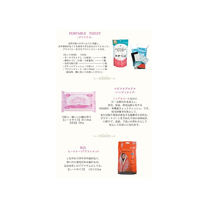 세트 내용:행거 파우치/프리미엄 포터블 화장실(3회분)/생리용 napkin(센터 잉꼬《파쿠토》마리부24cm8 매들어감)/무알콜 다기능 웨트(wet) 티슈(10 매들어감)/고품질 blanket/방재 장갑/3M방 하지 않겠 마스크/ 이상각1점