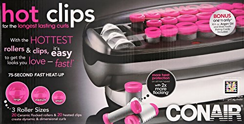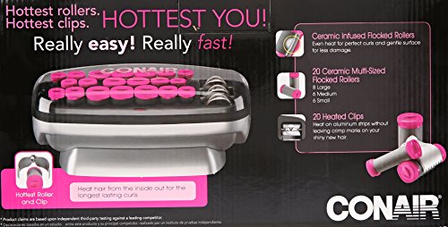 Includes: 20 ceramic flocked rollers of three different sizes to create dynamic and dimensional curls; 1.) Eight 1 1/4-inch jumbo rollers 2.) Six 1-inch medium rollers 3.) Six 3/4-inch small rollers - AND - 20 heated clips