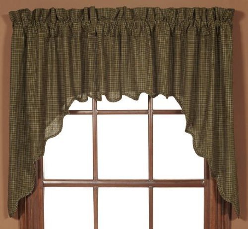 Tea Cabin Scalloped Swags 72" Wide x 36" Long Priced and sold as a set. Set of 2 swags, each swag measuring 36" drop by 36" width. 2" header included in overall measurement. 3-1/4" rod pocket. 100% pattern fabric cotton, lined with cotton. Designed and manufactured by Lasting Impressions for VHC Brands.Feature