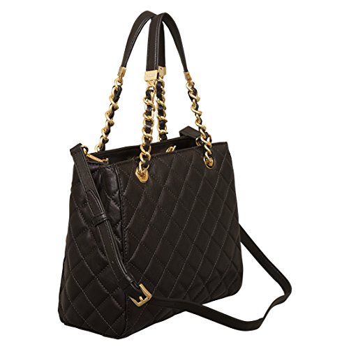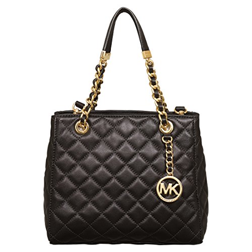 -. Brand : MICHAEL -. Color : Black -. Department : womens -. EAN : 0711746083973 -. Feature : Made of quilted Leather and Gold hardware / Double chain straps and a removable, adjustable shoulder strap / Magnetic tab snap closure / Five interior pockets plus key leash / 9.5"W x 8"H x 3.25"D - Drop = 6" and 19" -. ProductGroup : Shoes -. ProductTypeName : HANDBAG -. Title : MICHAEL Small Susannah NS Tote in Black -. UPC : 711746083973
