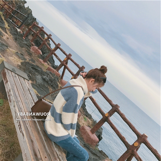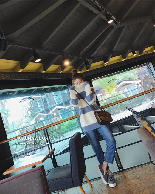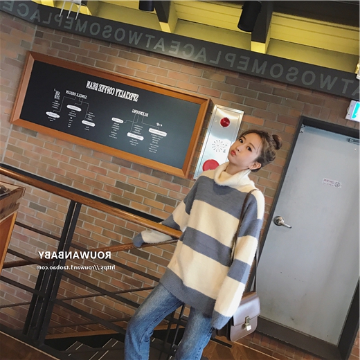 やや毛足の長いハイネックニット×太目のボーダーでガーリーカジュアルな着こなしに♪
