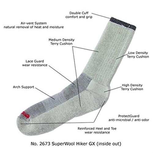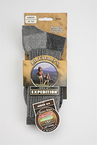 The J.B. Field's Super Wool Hiker GX is an all season sock that is meant for outdoor activities such as backpacking, hiking, and camping. These socks are a steal and when compared to the competition Smart Wool isn't the smart choice, especially considering they charge around $20 for one pair. We are so confident that you will like our socks all of them come with our No Risk Guarantee, best of all they are made here in North America! Exceptional value coupled with unique features such as anti-microbial, arch support, a half cushion, and impact support zones ensure that this sock will outlast the competition. It will keep you feet warm and dry when it matters the most. If you just buy one sock this year make it the Super Wool Hiker GX, you won't be disappointed!Feature