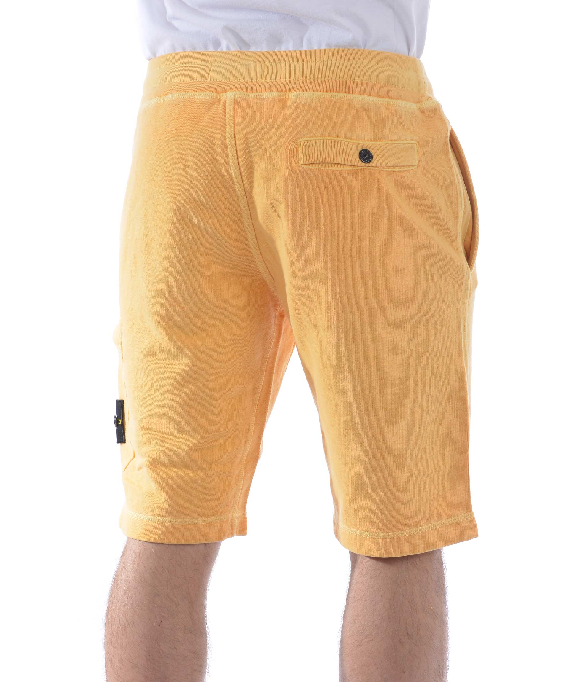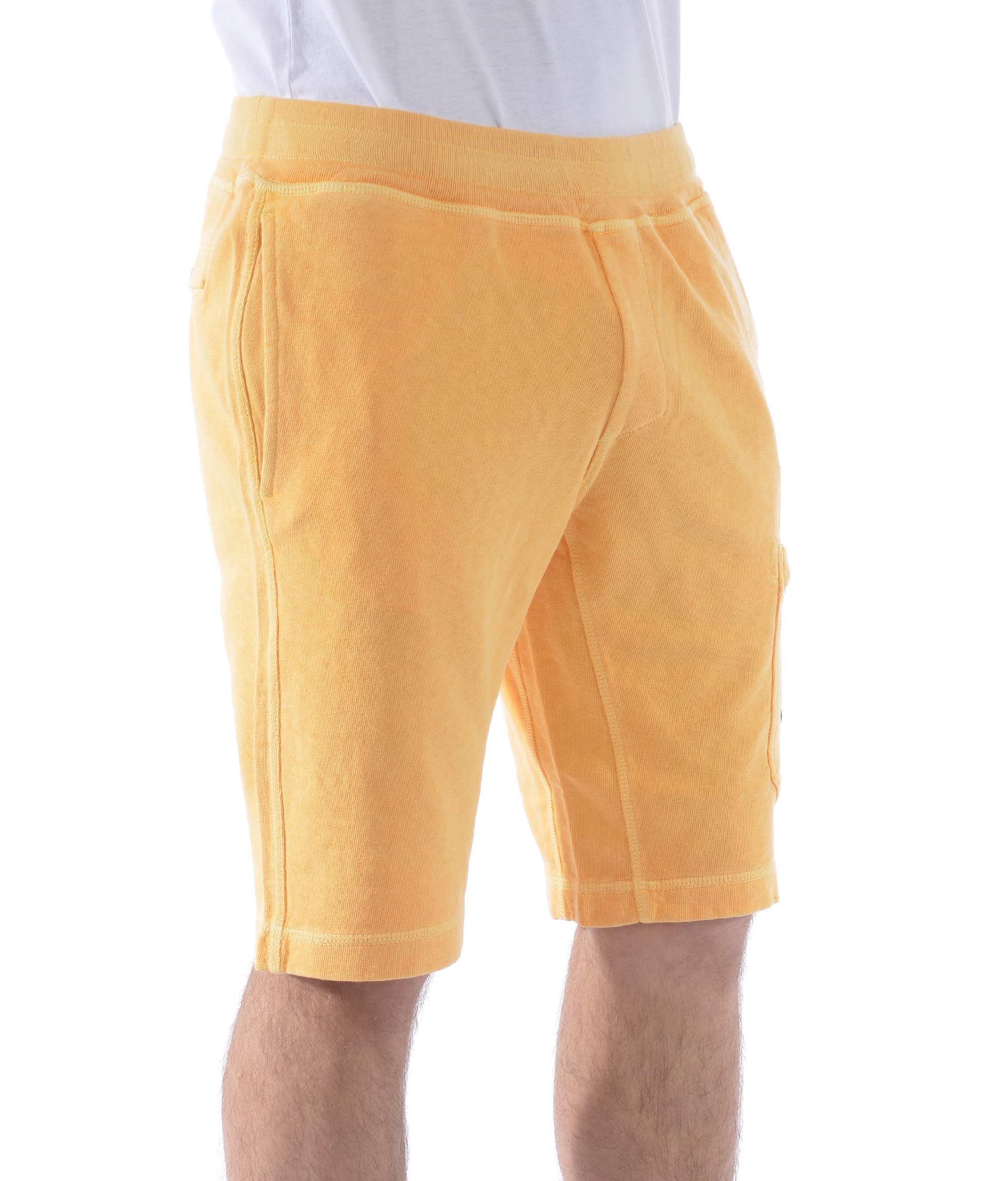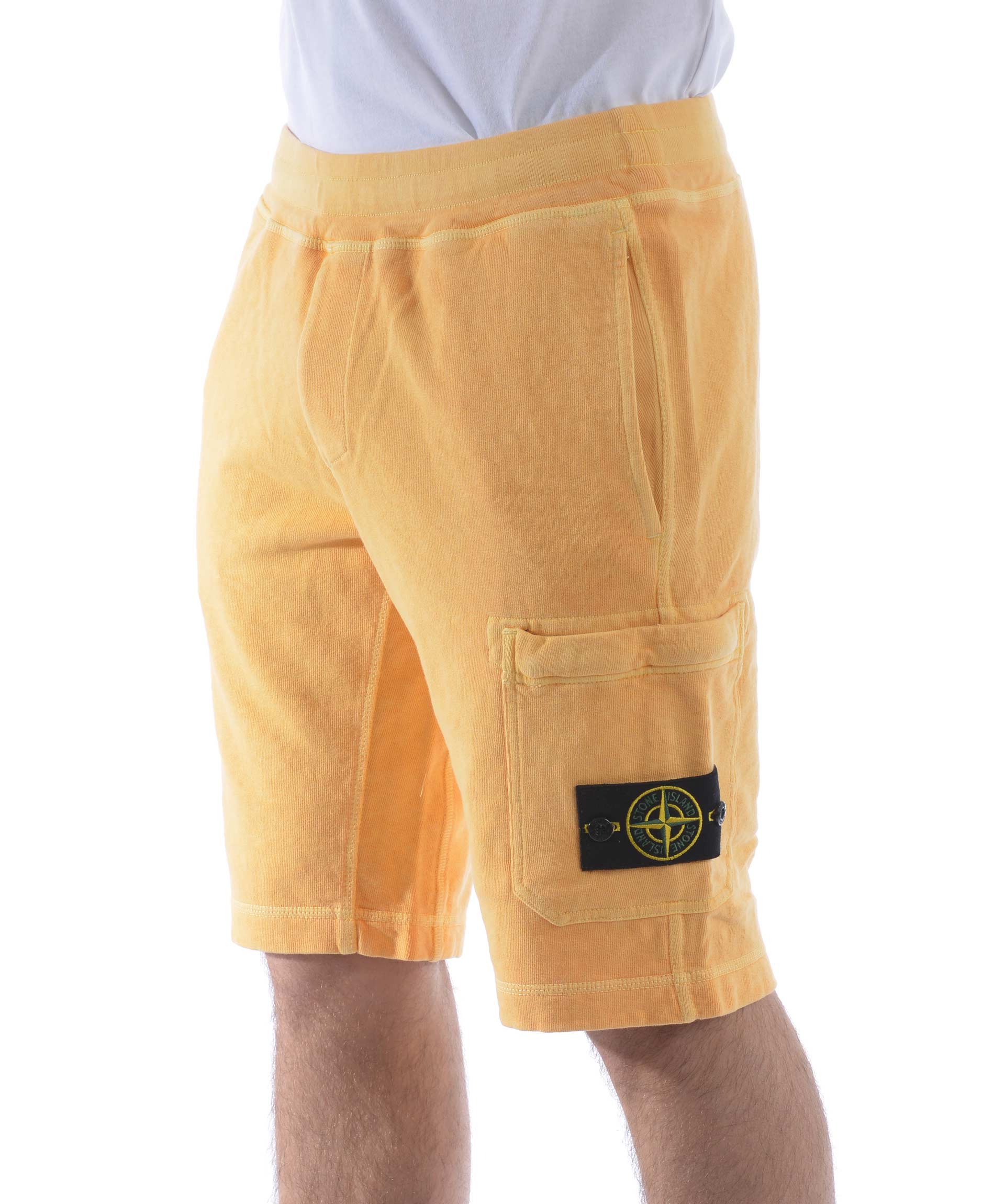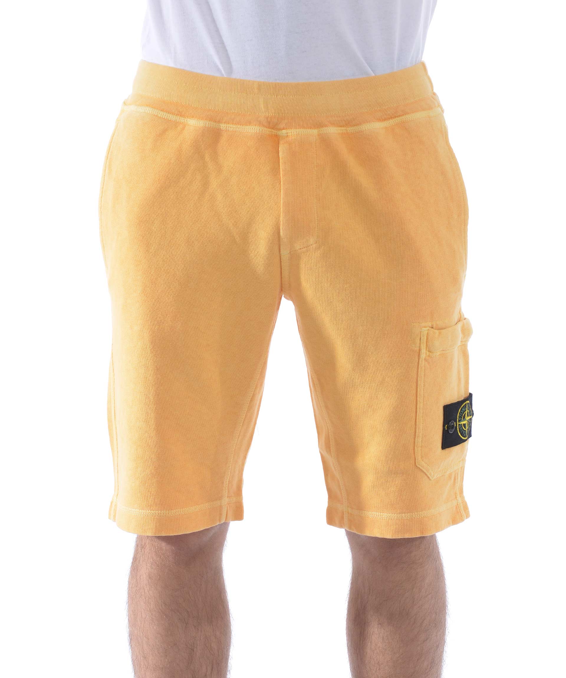 Shorts Stone Island in cotone malfilè Giallo tuorlo. Trattamento effetto old. Elastico in vita con coulisse interna. Tasche frontali a filo. Tascone sulla gamba con zip e patch logo removibile. Tasca posteriore con bottone.