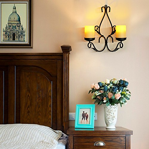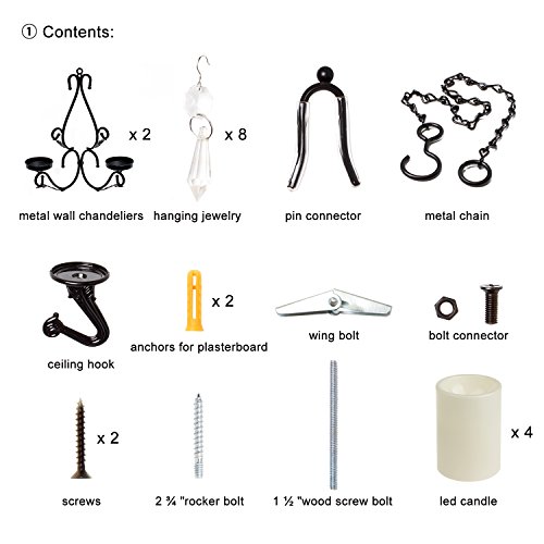 Package 1 * user manual 2 * metal wall chandeliers 4 * Flameless candle (Batteries not included) 8 * hanging jewelry 1 * bolt connector 1 * pin connector 1 * metal chain 1 * metal support hook 1 * ceiling hook 1 * 1 ½ "wood screw bolt 1 * 2 ¾ "rocker bolt 1 * wing bolt 2 * screws 2 * anchors for plasterboard