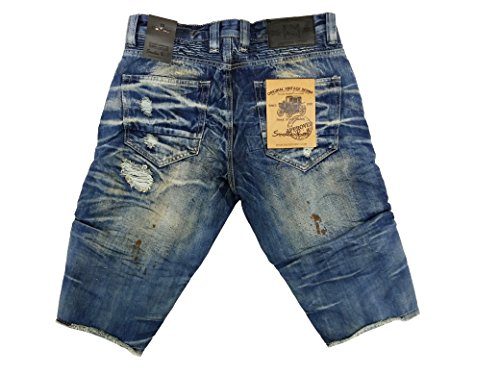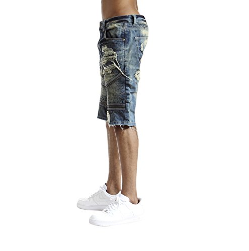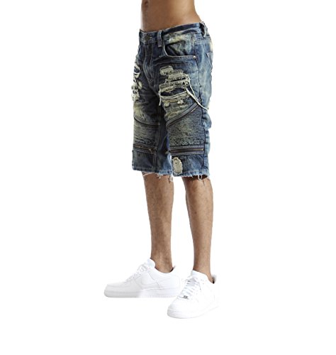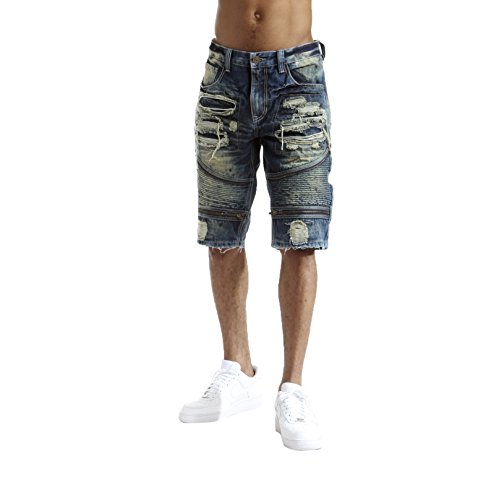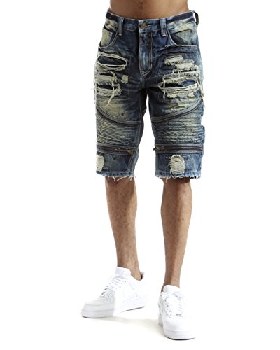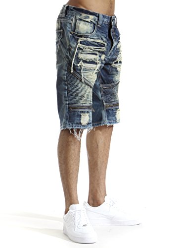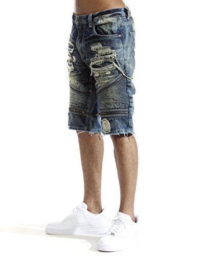 Studio : Smoke Rise Publisher : Smoke Rise Binding : Apparel Product Description Smoke Rise slim fitting moto biker style denim shorts. Feature rip and repair detail and accordion stitching and zipper embellishment. These shorts have a unfinished hem with a fray. 0