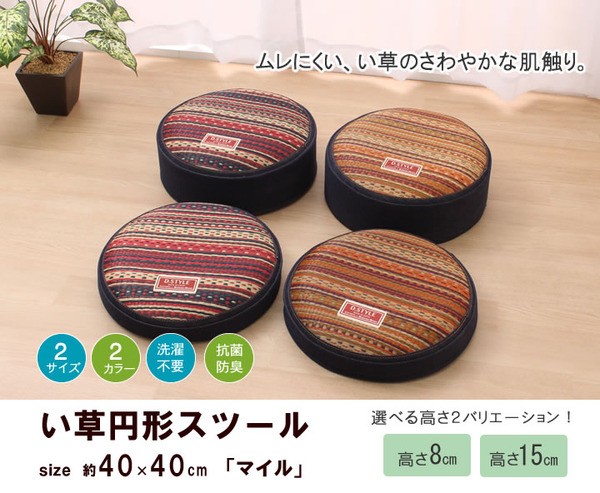 裏地、ヘリ・マチ部分に国産デニム生地を使用した少し高さが低めのスツールです。インテリア商材なのでデニム生地には色落ちをしにくい加工を施しています。リビングやキッチンでちょっと腰掛けたいときに重宝するイスです。お子様のイスとしてもご使用頂けます。軽量なので女性でも簡単に持ち運びができます。表生地には国産(九州産)のイ草を使用しています。国産イ草は一本一本が太く、表皮が厚く繊維がキメ細かいので弾力性があり、耐久性に優れています。その他イ草の効能として1.綿の約2.5倍の吸湿力 2.汗のにおいを軽減。汗のにおいの元となる化学物質を90%以上抑えます。などがあります。中材にはチップウレタンを使用しています。柔らかすぎずヘタリにくく、型崩れしにくいのが特長です。フローリングでのご使用にも適しています。い草の表面に天然青森ヒバ加工を施しています(抗菌・防臭効果)。青森県のヒバの木から抽出した「ヒバ油」をメーカー独自の技術で材料や商品に加工しました。「ヒバ油」には、ヒノキチオールという天然物質としては極めて抗菌性の高い成分が含まれ、医療や食品など多分野で利用研究が進められています。