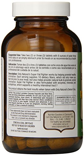 -. Binding : Health and Beauty -. Brand : Only Natural -. EAN : 0727413007265 -. Feature : Proper functioning of the intestinal tract depends upon the presence of adequate dietary fiber. / Only Natural's Super Fat Fighter provides a balance of crude and dietary fibers / The dietary fiber of soluble fiber such as nopal, flaxseed, hoodia, oat bran, psyllium, glucomannan and pectin promotes metabolism of fats -. IsAdultProduct : 0 -. IsAutographed : 0 -. IsMemorabilia : 0 -. Label : Only Natural -. LegalDisclaimer : Actual product packaging and materials may contain more and different information than what is shown on our website. We recommend that you do not rely solely on the information presented and that you always read labels, warnings, and directions before using or consuming a product. Please see our full disclaimer below. -. Manufacturer : Only Natural -. Model : 726 -. MPN : N/A -. NumberOfItems : 1 -. PackageQuantity : 1 -. PartNumber : N/A -. ProductGroup : Health and Beauty -. ProductTypeName : HEALTH_PERSONAL_CARE -. PublicationDate : 2011-01-12 -. Publisher : Only Natural -. Size : 90 -. Studio : Only Natural -. Title : Only Natural Super Fat Fighter (nopal Leaner Formula), 90-Count -. UPC : 727413007265