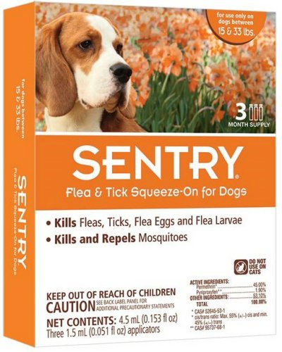 Studio : Sergeants Publisher : Sergeants Binding : Misc. Product Description Sentry Pro Squeeze-On Flea Tick for Dogs kills and repels fleas and ticks for up to a month. Kills flea eggs and larvae. Kills and repels mosquitoes. Kills flea eggs and larvae up to 4 months. Kills and repels fleas, ticks and mosquitoes for up to one month. Use only on dogs 3 months and older. Do not use on cats. Wash your hands after handling pet food or pet treats or touching an animal, animal feed, or animal waste. 0