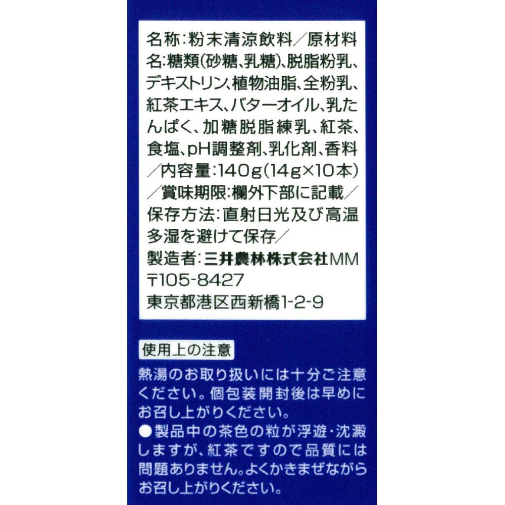 Ingredients: sugar (sugar, lactose), skim milk powder, dextrin, vegetable oil, whole milk powder, black tea extract, butter oil, milk protein, sweetened condensed skim milk, tea, salt, pH adjusting agents, emulsifiers, flavoring
